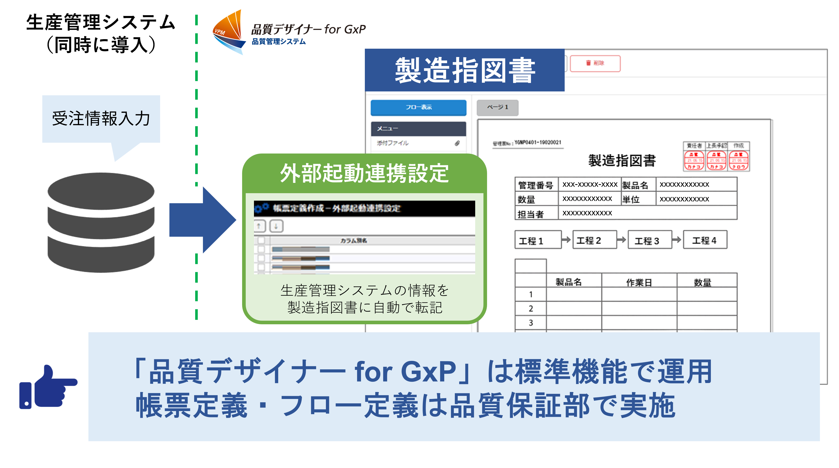 まずは「1次開発」として、生産管理システム→品質デザイナー for GxPの連携を実施。生産管理システムに受注情報を入力して画面上のボタンを押すと、製造指図書が「品質デザイナー for GxP」で自動起票される仕組みです。