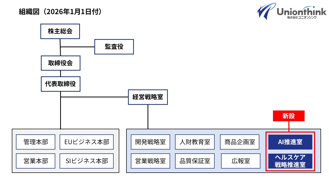 医薬品・医療機器製造業を中心に自社開発ソフトウェア「デザイナーシリーズ」を展開する株式会社ユニオンシンク(本社:大阪市中央区、代表:西谷 洋志、以下当社)は、2026年1月1日付で、「AI推進室」と「ヘルスケア戦略推進室」の2つの新部署を設立したことをお知らせします。